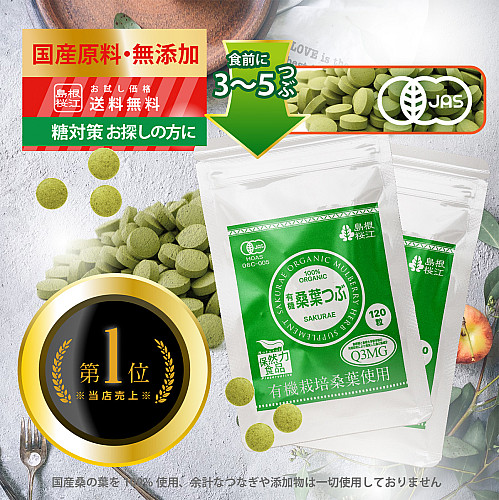 島根県桜江町(さくらえちょう)で有機栽培した桑の葉を100%使用した「有機 桑葉つぶ」。